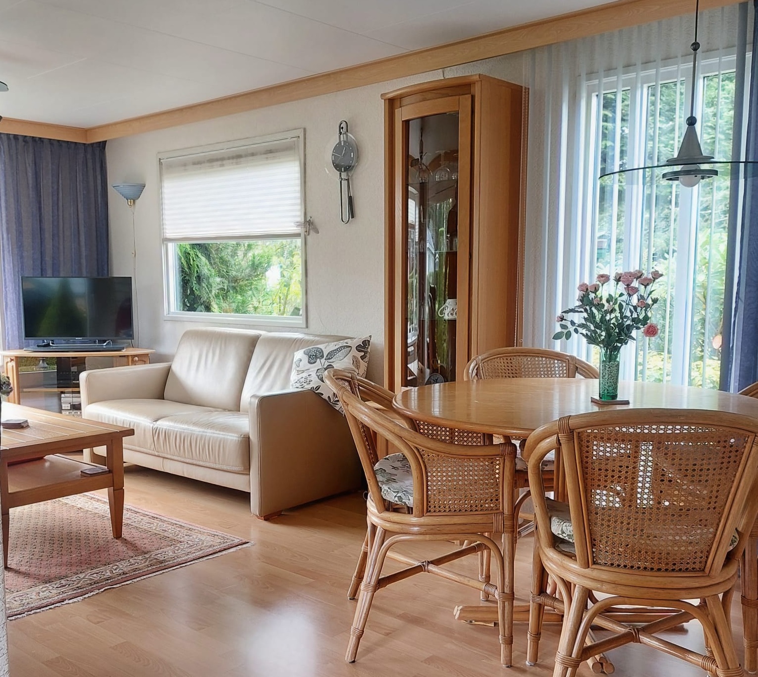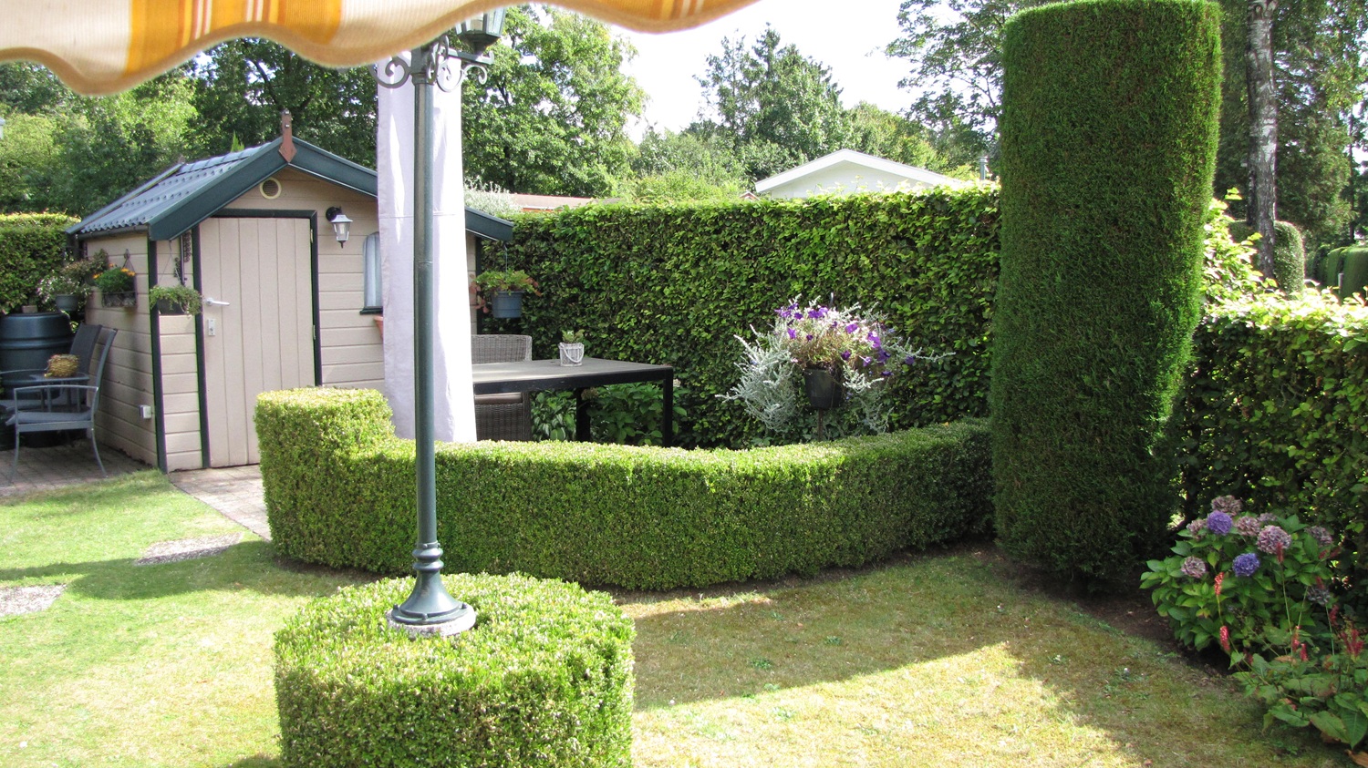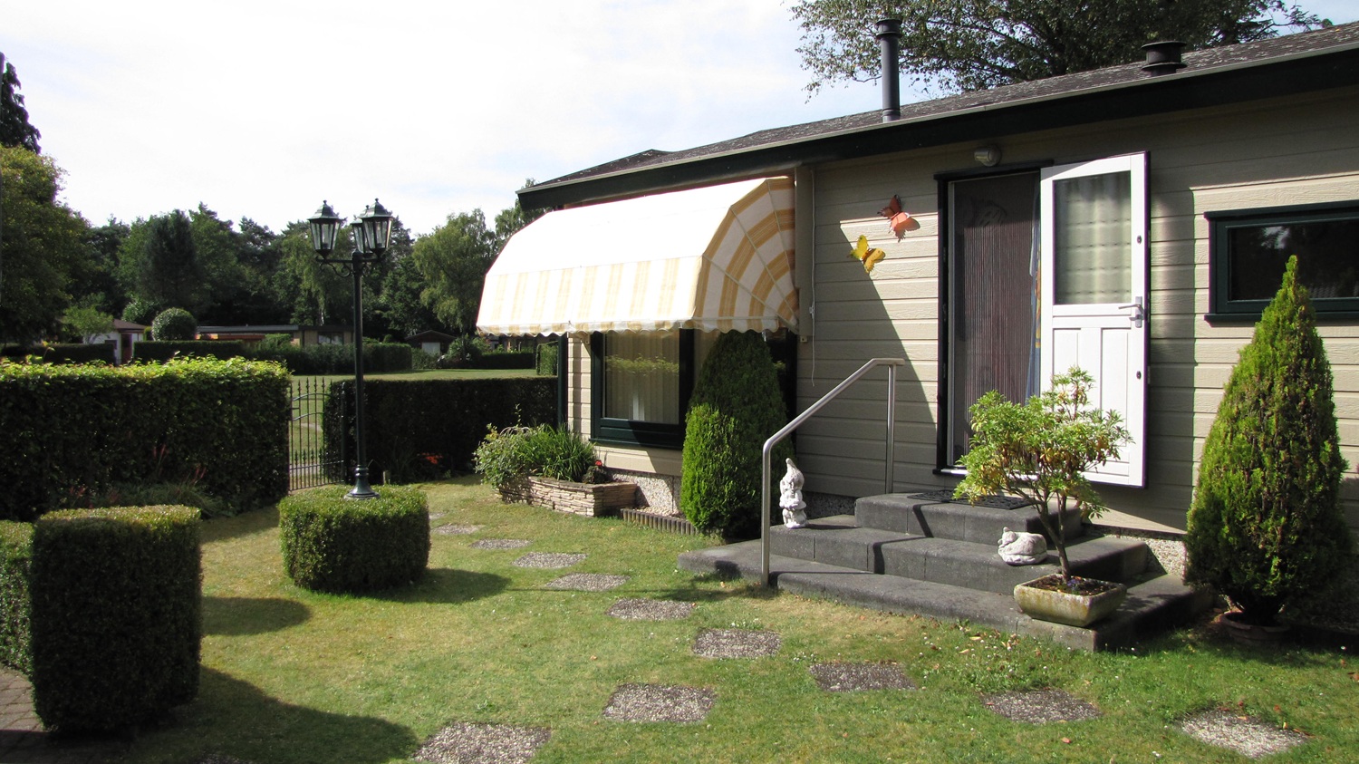 Om het plaatje compleet te maken zitten er mooie markiezen aan de voorzijde en bij de tuindeuren.