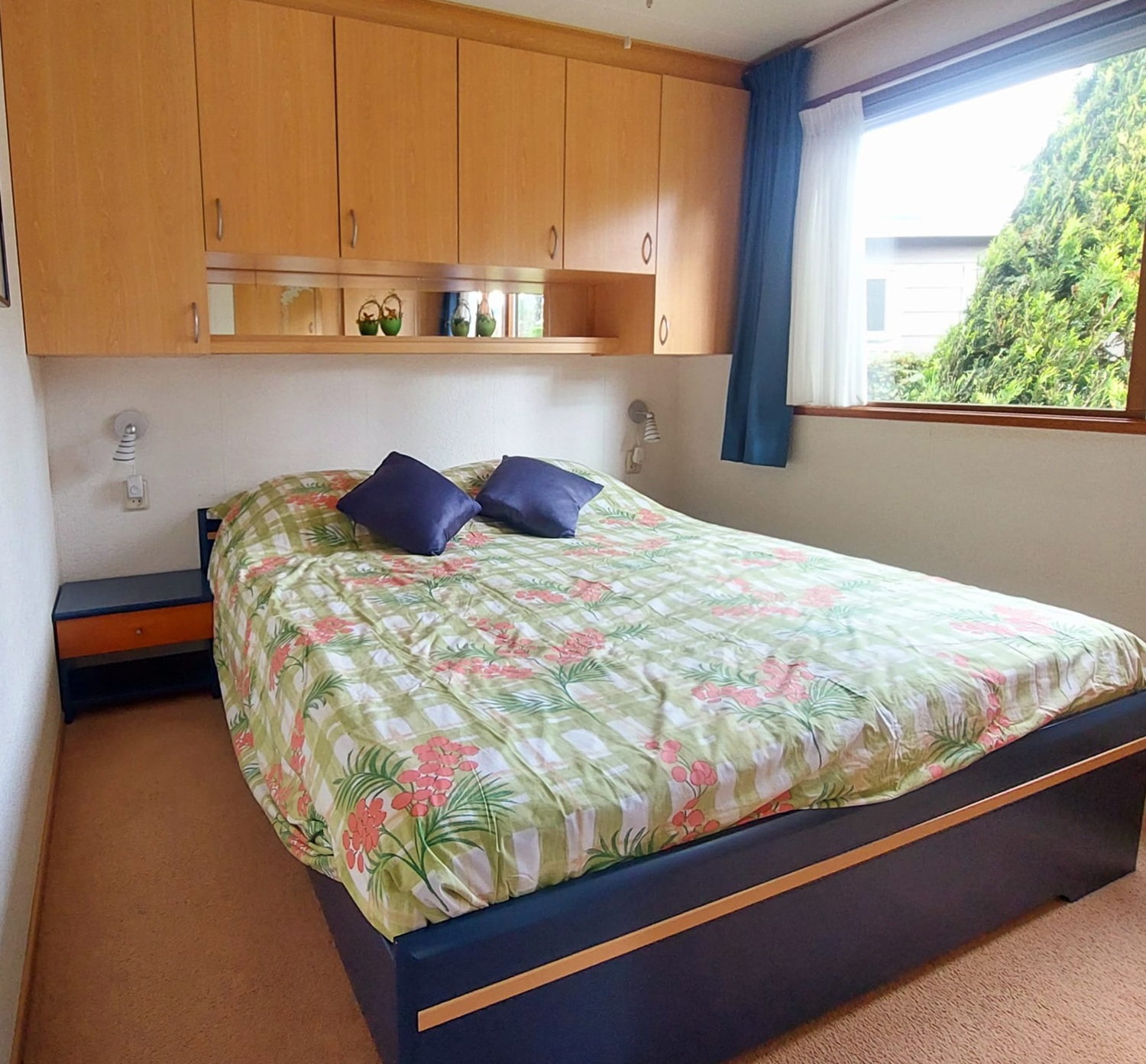 1 grote slaapkamer met een 2-persoonsbed, bovenkasten en een grote schuifdeurkast.