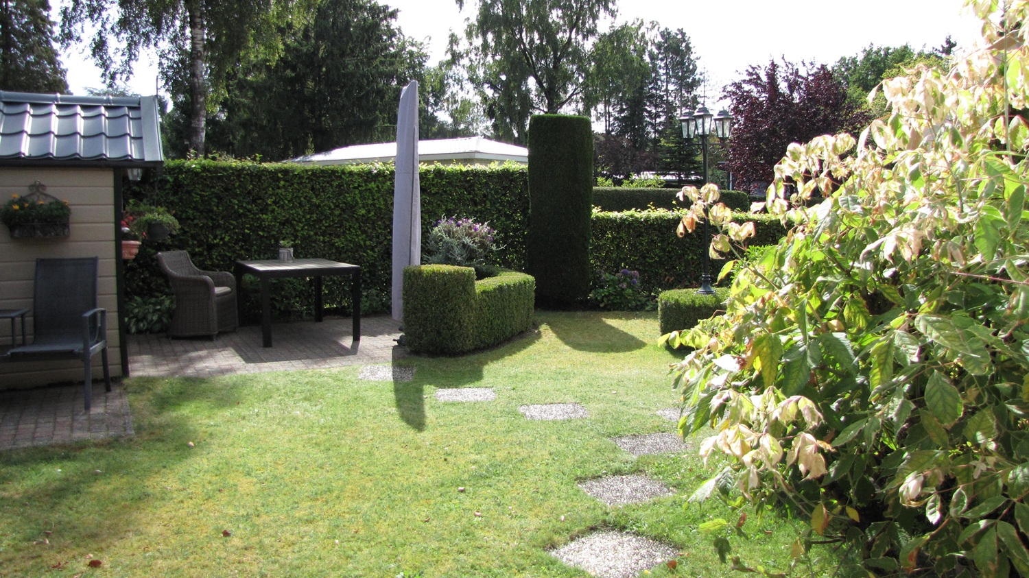 In de mooi aangelegde tuin, staat een blokhut met diverse gereedschappen.