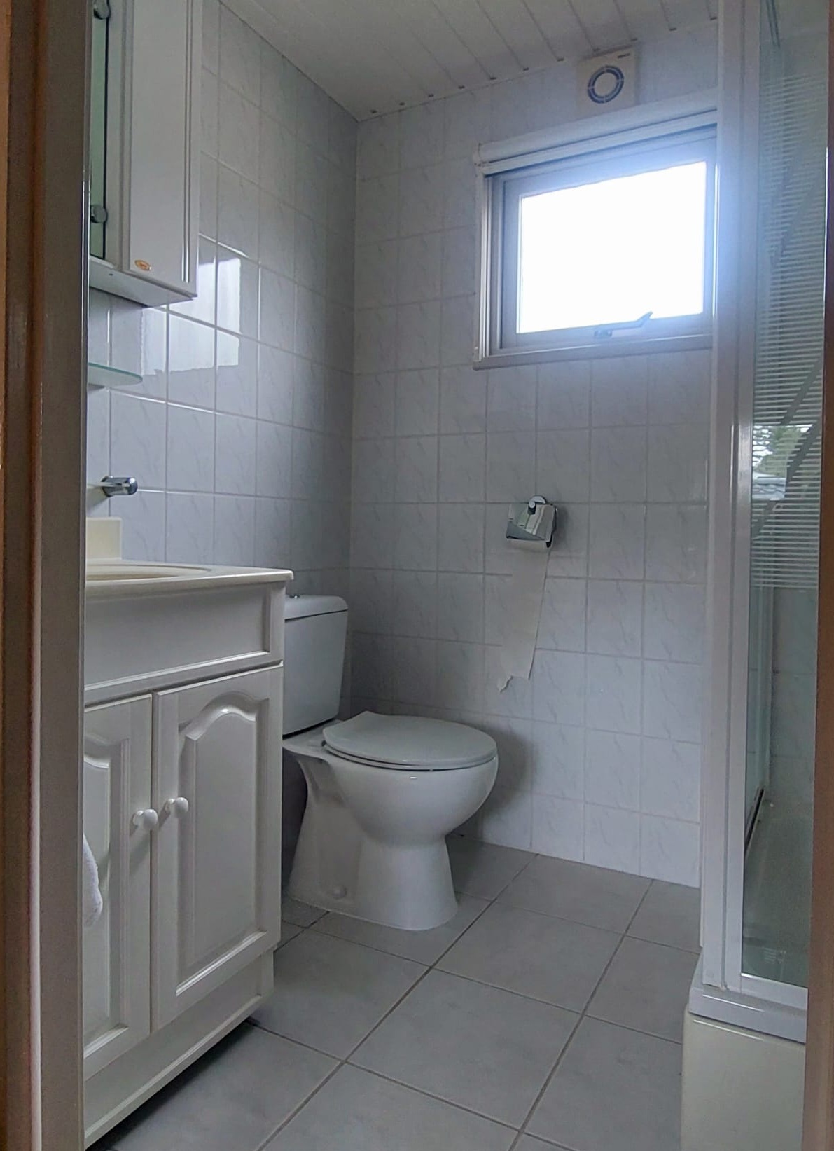 De badkamer is betegeld en heeft een douchecabine, toilet, wastafelmeubel en aansluiting voor de wasmachine.