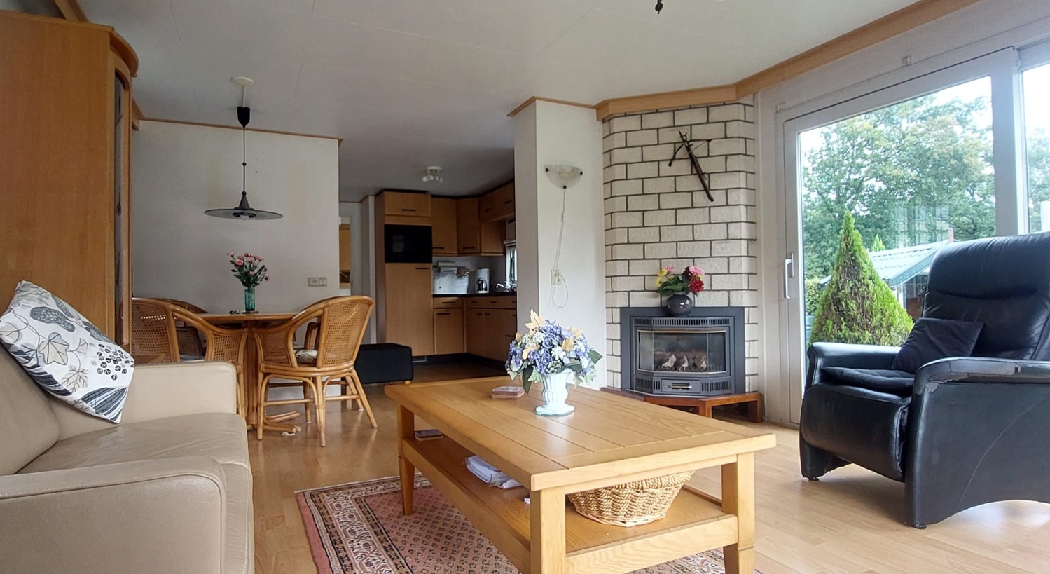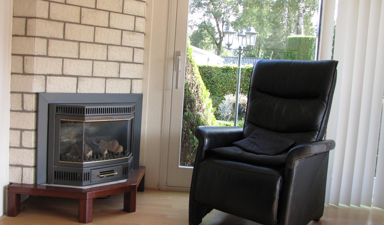 De sfeervolle gashaard verwarmt het geheel gecombineerd met de gecombineerde elektrische airco/verwarming unit in de erker.