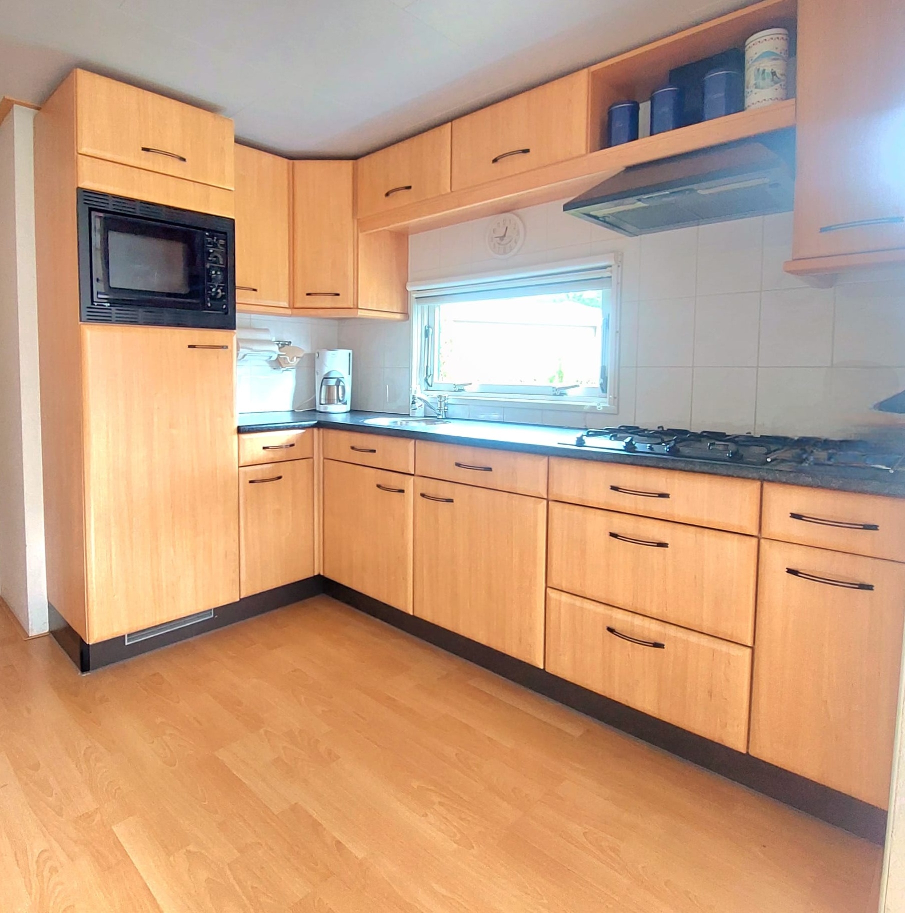 De ruime en nette houtkleurige L- keuken heeft een koelkast met vriesvak, combi-oven, gaskookplaat en afzuigkap.